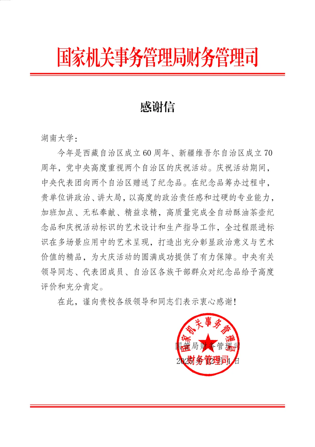 国家感谢信@湖南大学!