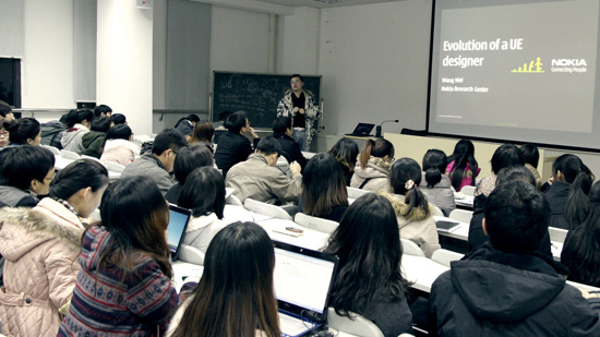 本次讲座的主题是Evolution of a UE designer,我们很荣幸请到来自Nokia research center的王巍博士,与大家分享一个交互设计师进化的过程、路线。Nokia research center现在在全球有500人,1986这个组织成立。现在在各地都有团队,以后其他地区的团队也会来湖南大学跟大家交流。