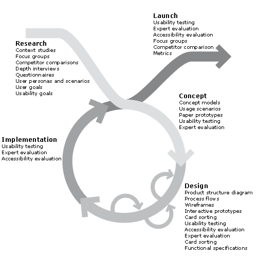 王巍博士又提出,现在UCD很火,但是UED是否等同于UCD?如果UE+design该如何去做? 讲到这里他提到了英国的Flow Interactive 交互设计咨询公司所描述的经典的UCD 实施流程。 他们大概把UCD的流程分为了下面几个阶段: Research stage 调查研究阶段 Concept stage 概念定义阶段 Iterative design stage 迭代的设计阶段 Implementation stage 执行阶段 Launch stage 发布阶段