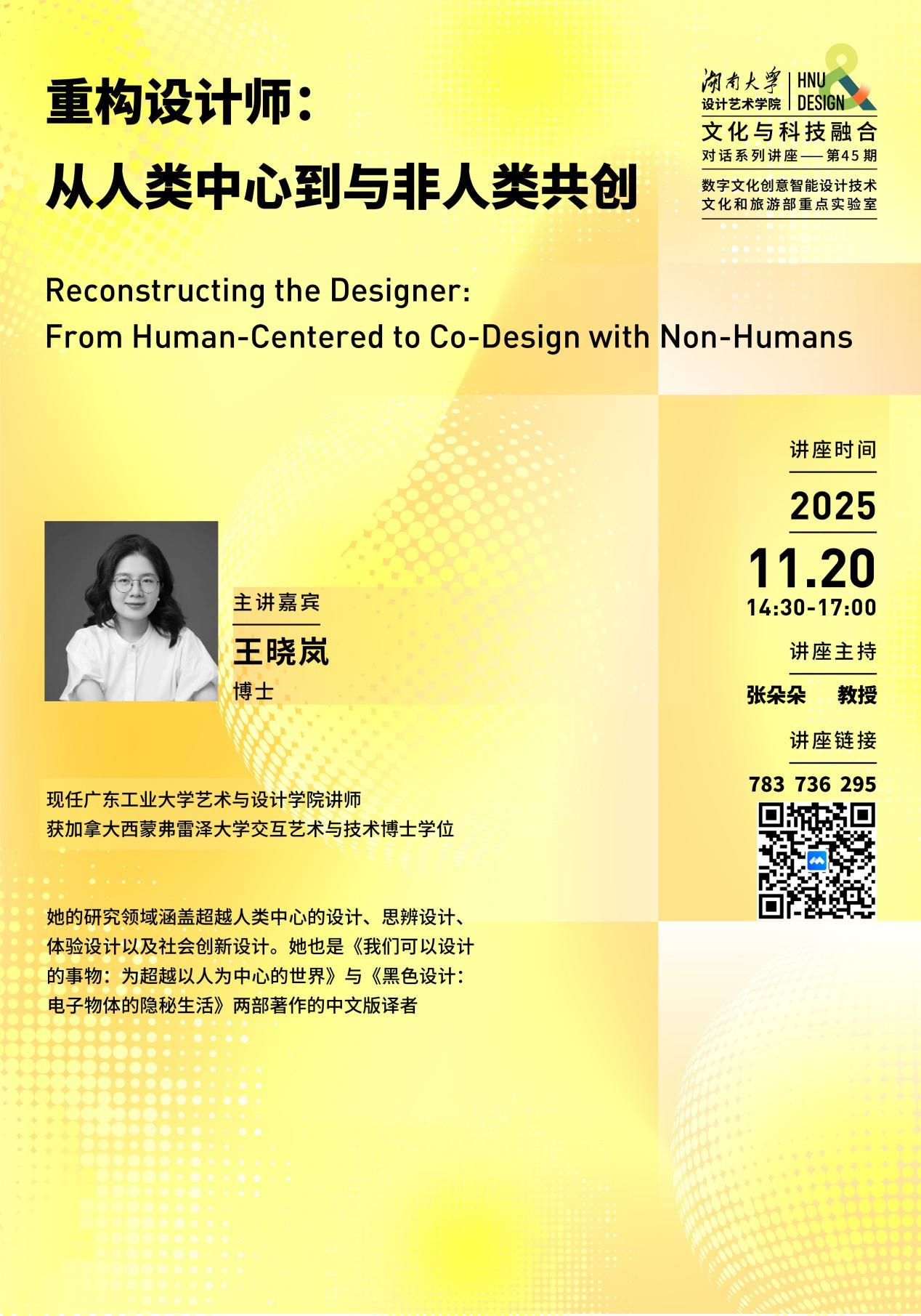 2025年11月20日下午14:30,由湖南大学设计艺术学院主办的“对话:文化与科技融合”系列讲座第45期在四合院103顺利举行。此次讲座荣幸邀请到加拿大西蒙弗雷泽大学交互艺术与技术博士、广东工业大学艺术与设计学院讲师王晓岚老师作为主讲嘉宾,带来了以《重构设计师:从人类中心到与非人类共创》为题的精彩演讲。该讲座是博士研究生课程《批判性与历史性研究》的系列教学活动之一,由该课程负责人张朵朵教授担任学术主持。
