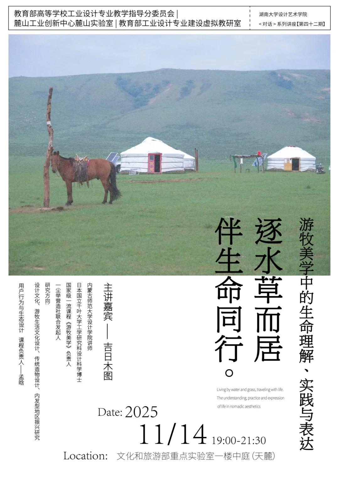2025年11月14日晚上19:00,由湖南大学设计艺术学院主办的“对话”系列讲座第42期于文旅部重点实验室一楼中庭顺利举行。此次讲座有幸邀请到内蒙古师范大学设计学院吉日木图作博士作为主讲嘉宾,带来了以《游牧美学中的生命理解、实践与表达 》为题的精彩演讲。该讲座是研究生课程《用户行为与生态设计》的系列教学活动之一,由该课程负责人孟晗副教授担任学术主持。