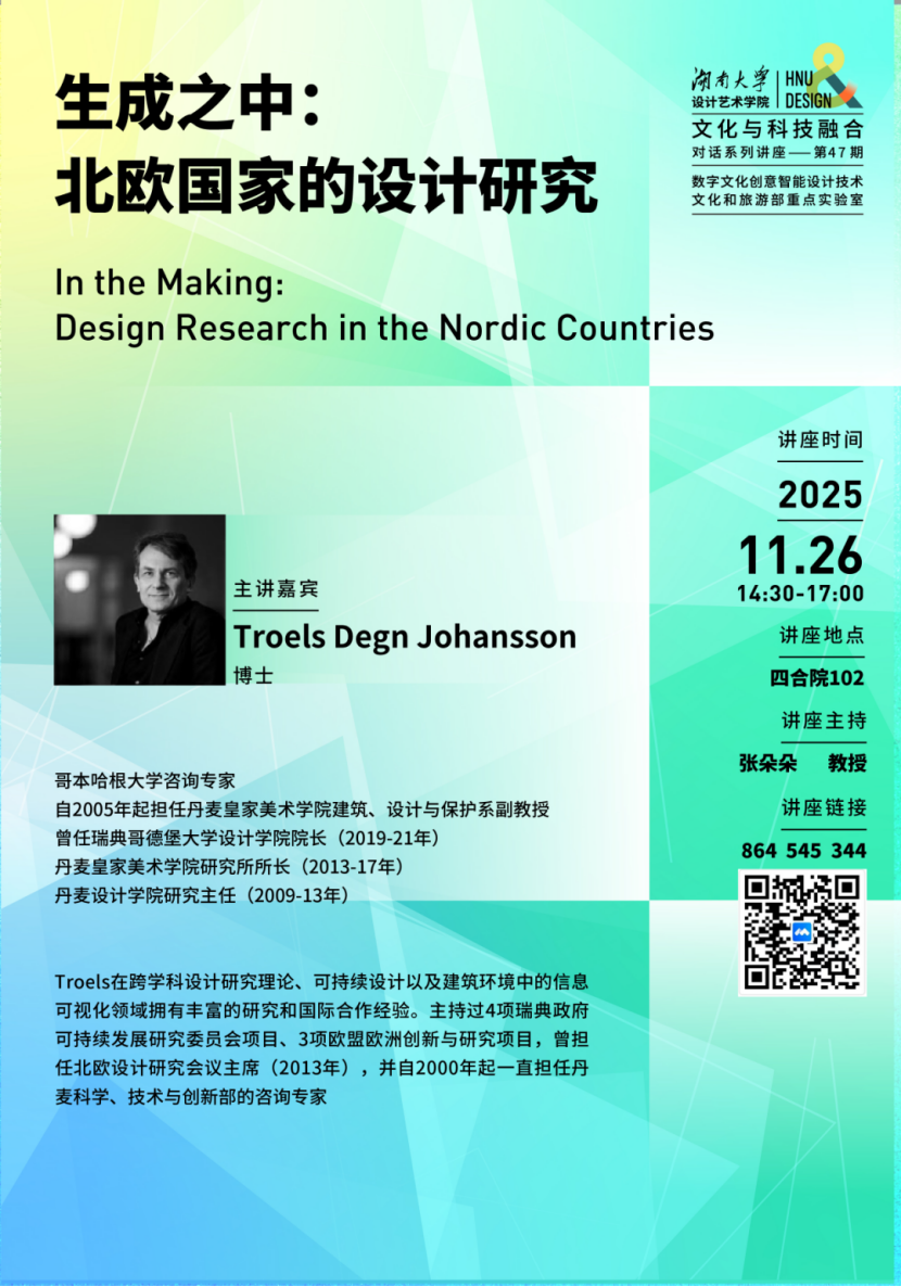 2025年11月26日下午14:30,由湖南大学设计艺术学院主办的“对话:文化与科技融合”系列讲座第47期在四合院102顺利举行。此次讲座荣幸邀请到丹麦皇家美术学院建筑、设计与保护系副教授Troels Degn Johansson作为主讲嘉宾,带来了以《生成之中:北欧国家的设计研究》(In the Making: Design Research in the Nordic Countries)为题的精彩演讲。讲座由湖南大学设计艺术学院张朵朵教授担任学术主持,同时也是博士研究生课程《批判性与历史性研究》的系列教学活动之一。