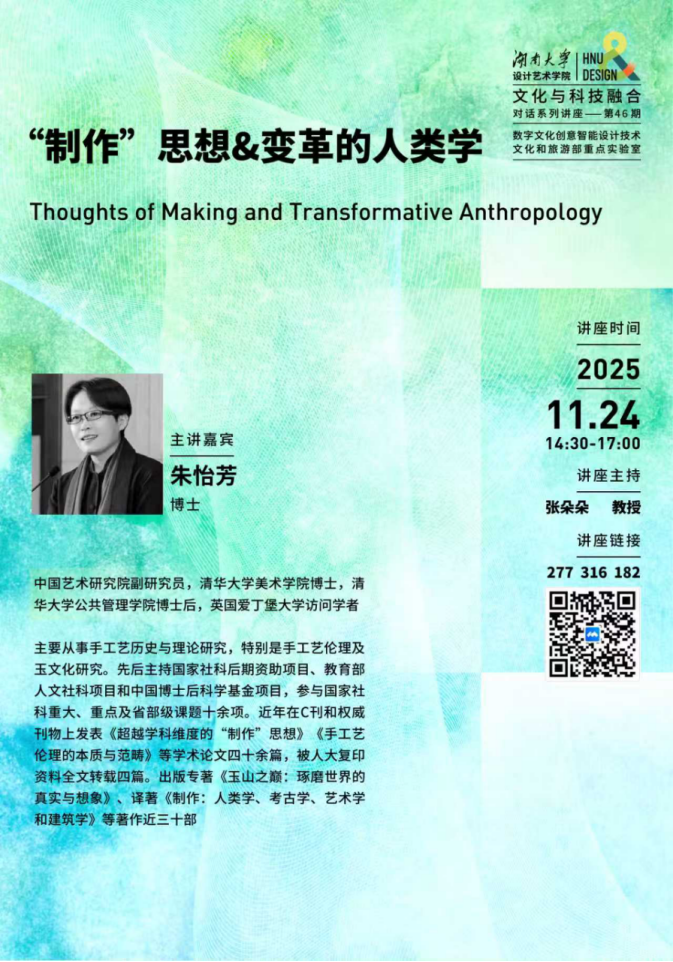 2025年11月24日下午14:30,由湖南大学设计艺术学院主办的“对话:文化与科技融合”系列讲座第46期在四合院101顺利举行。此次讲座有幸邀请到中国艺术研究院副研究员朱怡芳作为主讲嘉宾,带来了以《“制作”思想&变革的人类学》为题的精彩演讲。该讲座是博士研究生课程《批判性与历史性研究》的系列教学活动之一,由该课程负责人张朵朵教授担任学术主持。