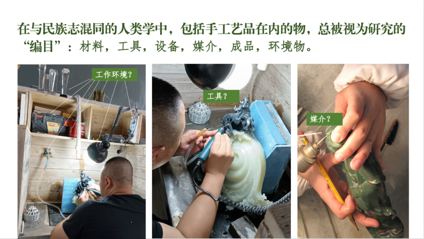 其次,朱老师结合不同领域的应用与案例对“制作”思想具体展开探讨,她指出制作思想不仅适用于手工艺研究,还扩展到设计、建筑、艺术等领域,强调实践中的知识生成。以玉文化研究为例,进一步展示了如何通过多元叙事理解物质文化的动态性。