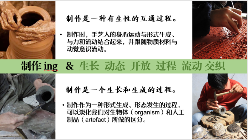 首先,朱怡芳老师分享了《制作》一书作者Tim Ingold思想的理论基础,指出“制作”思想强调过程性和身体参与,是一种动态、开放的概念,与传统的静态研究视角不同,它与人类学的本体论转向密切相关,打破了学科界限,强调学科融合。同时,朱老师指出“制作”思想中的关键概念包括“互通”(correspondence)、“织网”(meshwork)和“有生性”(animacy),这些概念十分强调物质与生命的动态联系。