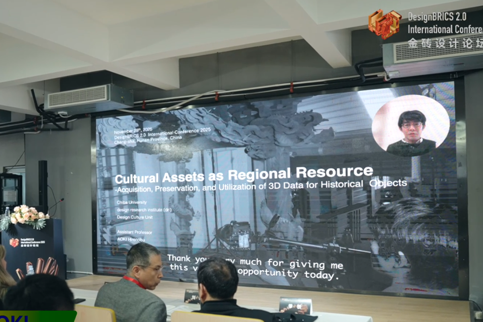 随后,金砖设计主旨演讲第9位嘉宾,日本千叶大学的Hironobu助理教授通过视频形式作报告,介绍其实验室在文化资产三维数据获取与应用方面的实践案例,他强调,3D数据技术不仅能为文化遗产保护提供科学依据,还可通过数字平台打破地域限制,让文化资产以更鲜活的形式融入现代设计,为可持续文化传播与创新设计提供新路径,同时期待与金砖国家学者在文化遗产数字化设计领域开展合作。