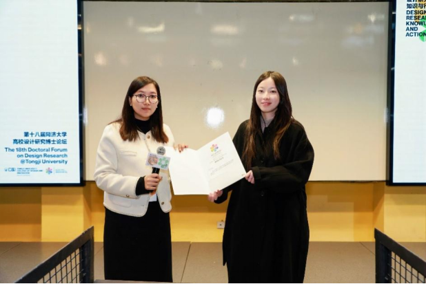 在论坛分享结束后,经过评议,高欣怡博士生的论文分享被评为“2025年第十八届(同济大学)高校设计研究博士论坛”优秀论文(三名之一)。该成果充分体现了我院在设计研究与人才培养方面的扎实基础与创新能力,也展现了青年学者在智能技术与交互体验方向的学术潜力与研究影响力。