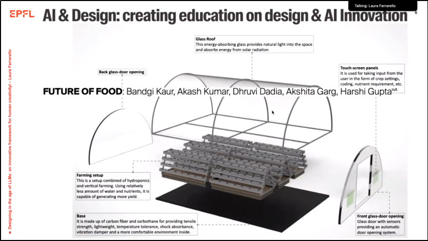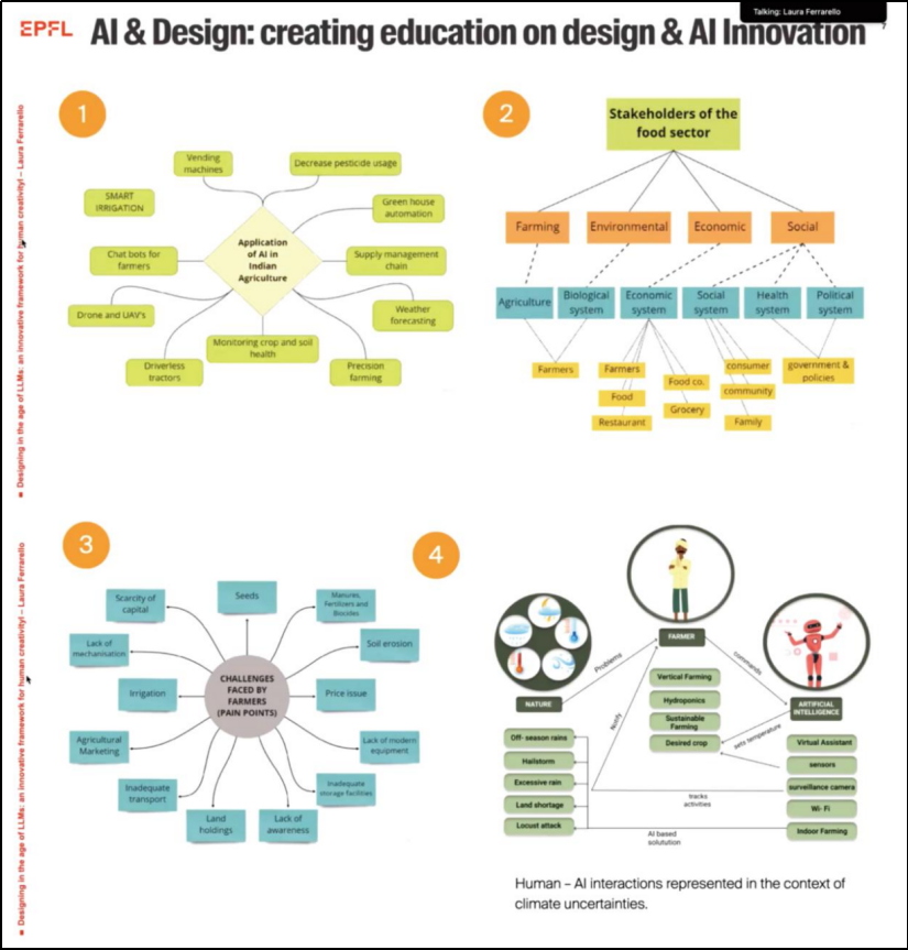 在进一步分享中,介绍了自己在多所国际知名高校开设的《人工智能与服务产品设计》(Designing Services and Products with Artificial Intelligence)课程实践,重点介绍了“未来食品”(Future of Food)项目。该项目通过识别多元利益相关方,明确AI介入的应用场景,探索利用AI技术传播传统农业知识,以应对气候变化和农业生产力等全球性挑战。此案例不仅呈现了AI技术在可持续设计中的具体应用路径,也体现了设计教育向跨学科与社会价值导向转型的趋势。