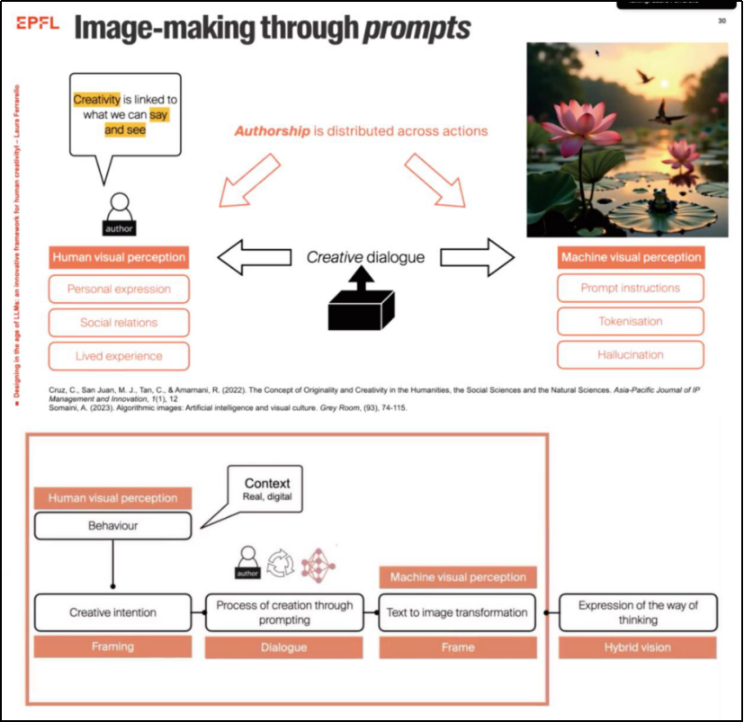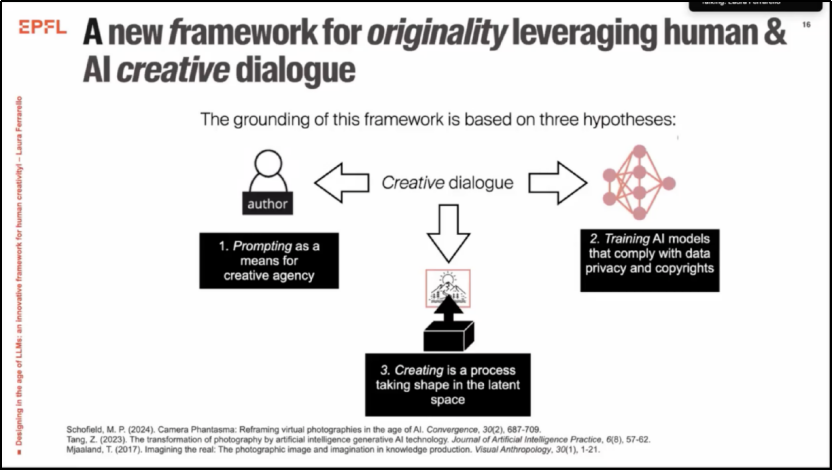 围绕AI的发展,Laura博士指出,以DeepSeek与Gemini为代表的新一代大语言模型正推动人机交互范式由命令式向自然语言对话转变,显著提升了创新效率并降低了技术门槛。基于此,她提出AI时代创意实践的核心对话框架:精准提示词的生成、合法合规的数据训练、以及具备文化归属与个体意识的创作空间。她强调,创造力是“意图—过程—情境”的系统性结合,原创性则根植于人类意图的清晰表达与语境中的创新生成。