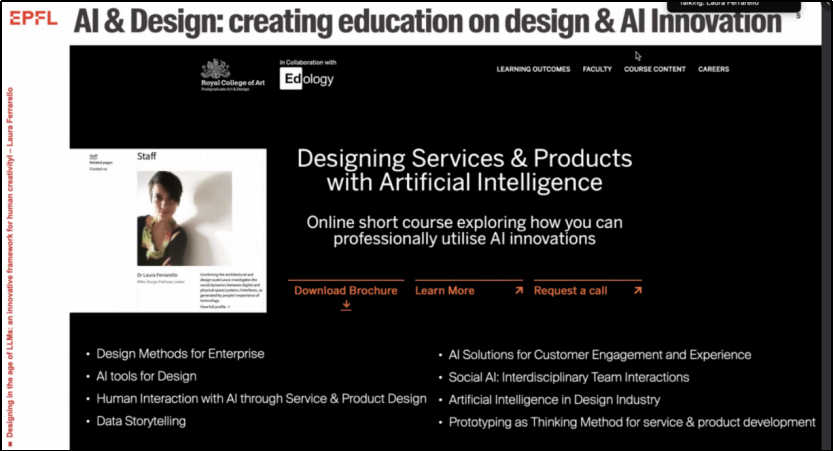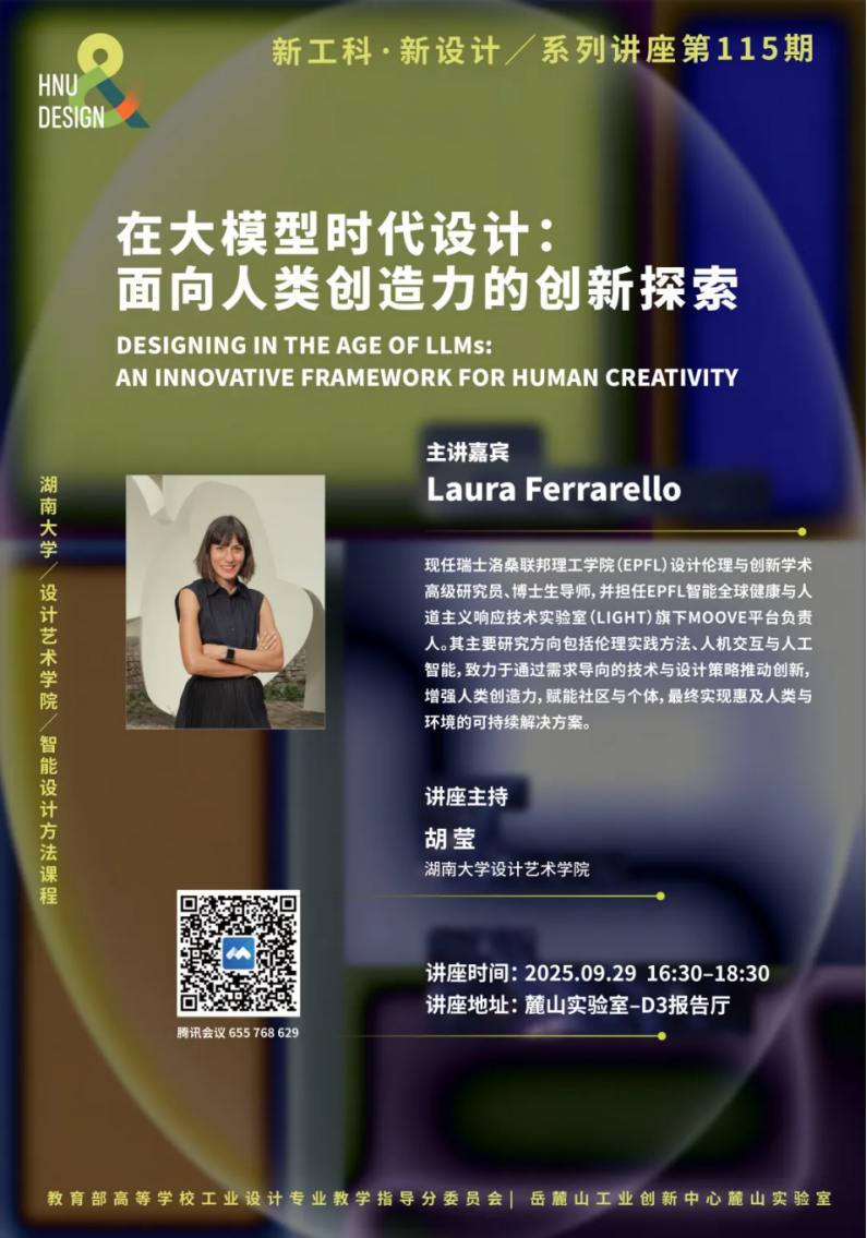 2025年9月29日下午,由湖南大学设计艺术学院主办的“新工科 · 新设计”系列讲座第115期,在麓山实验室D3报告厅顺利举行。此次讲座荣幸邀请到瑞士洛桑联邦理工学院(EPFL)设计伦理与创新高级研究员,EPFL智能全球健康与人道主义响应技术实验室(LIGHT)旗下MOOVE平台负责人Laura Ferrarello博士作为主讲嘉宾,为大家带来了一场以《在大模型时代设计:面向人类创造力的创新探索》为题的演讲,在线分享其在人工智能与设计融合领域的最新研究与实践成果。