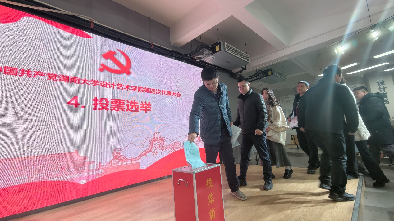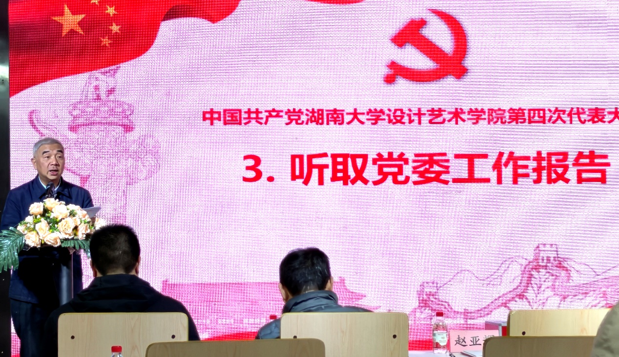 2026年1月5日下午,中国共产党湖南大学设计艺术学院第四次代表大会在学院报告厅隆重召开。本次大会是在学院深入学习贯彻党的二十大精神,全面落实学校第十次党代会部署要求,奋力推进高水平设计学科建设的关键时期召开的一次承前启后、继往开来的重要会议。大会应到代表50名,实到代表48名,符合规定人数。