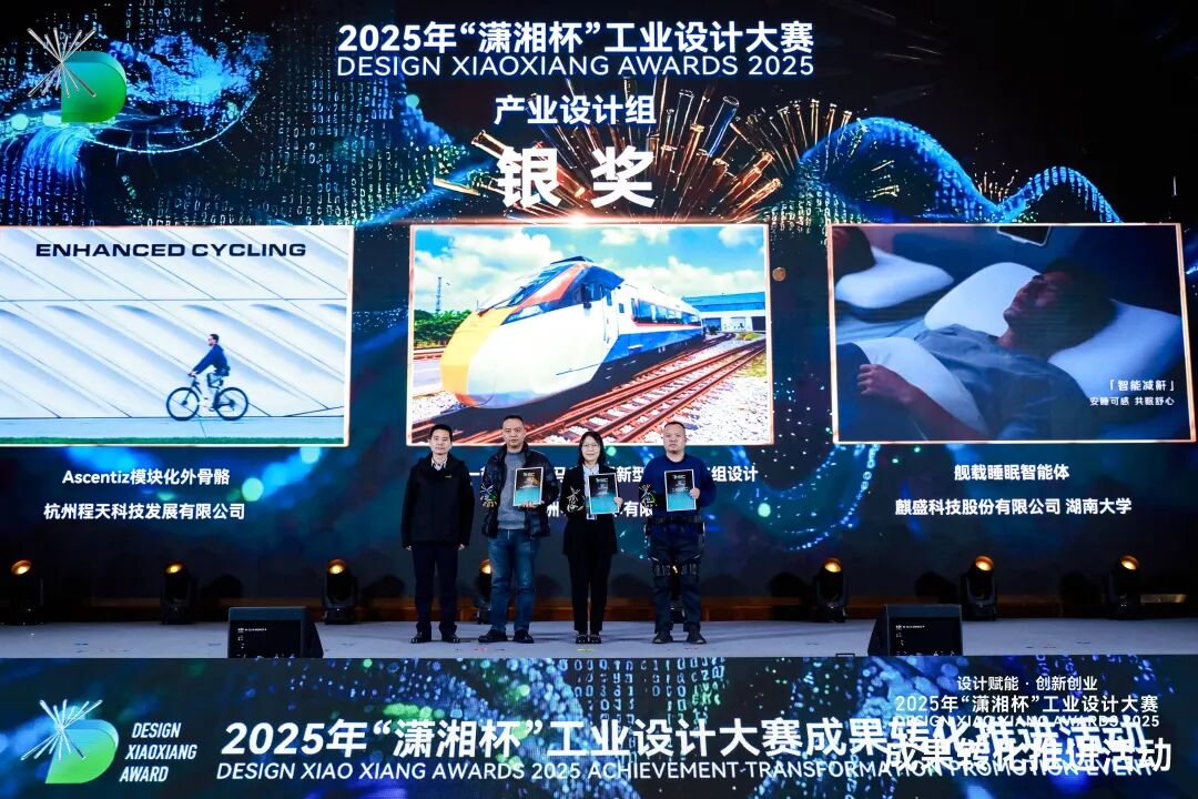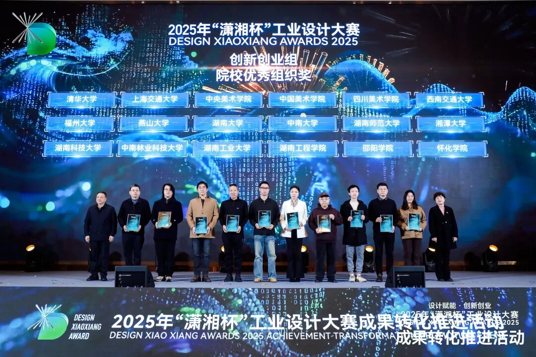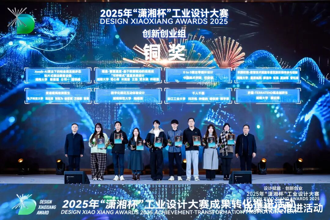 1月19日,2025年“潇湘杯”工业设计大赛成果转化推进活动在长沙举行。大赛获奖名单在现场隆重揭晓,我院师生团队斩获创新创业组金奖1项、铜奖4项、优秀奖5项,荣获创新创业组“院校优秀组织奖”。我院与麒盛科技股份有限公司、长沙斐视科技有限公司、湖南维大开物科技有限公司等企业合作研发的3项智能产品分别获得产业设计组银奖、铜奖及优秀奖。