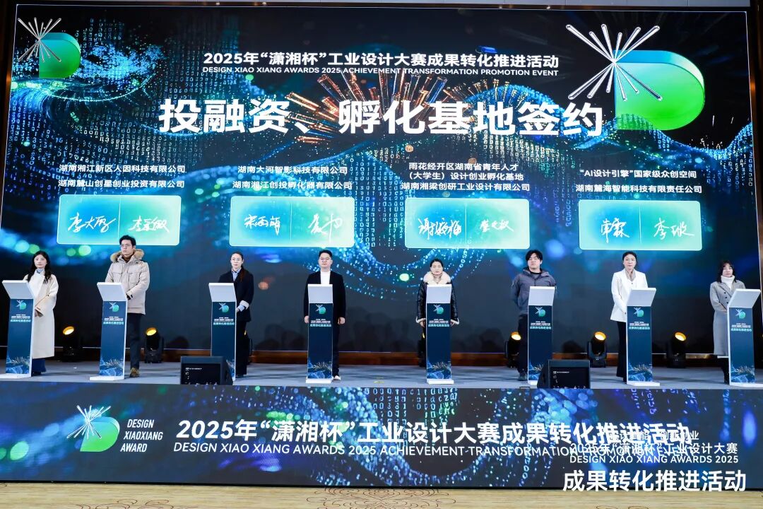活动现场为获奖代表颁奖,8支优秀团队与投融资机构、孵化基地、制造企业现场签约。“AI设计引擎”国家级众创空间、雨花经开区湖南省青年人才(大学生)设计创业孵化基地作现场推介,相关企业发布最新设计产品。本次活动构建“展示—颁奖—分享—签约”闭环,配套创业辅导、投融资对接、孵化入驻等全链条服务,打通设计成果转化“最后一公里”。创新创业组获奖作品可直推至“湖南省大学生创业投资基金”,最高可获100万元专项投资支持,实现“以赛促创、以创促产”良性循环。